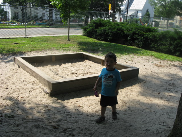We went looking for sand. We were told by one of the preschool teachers that the sandbox is always uncovered and often used by animals.