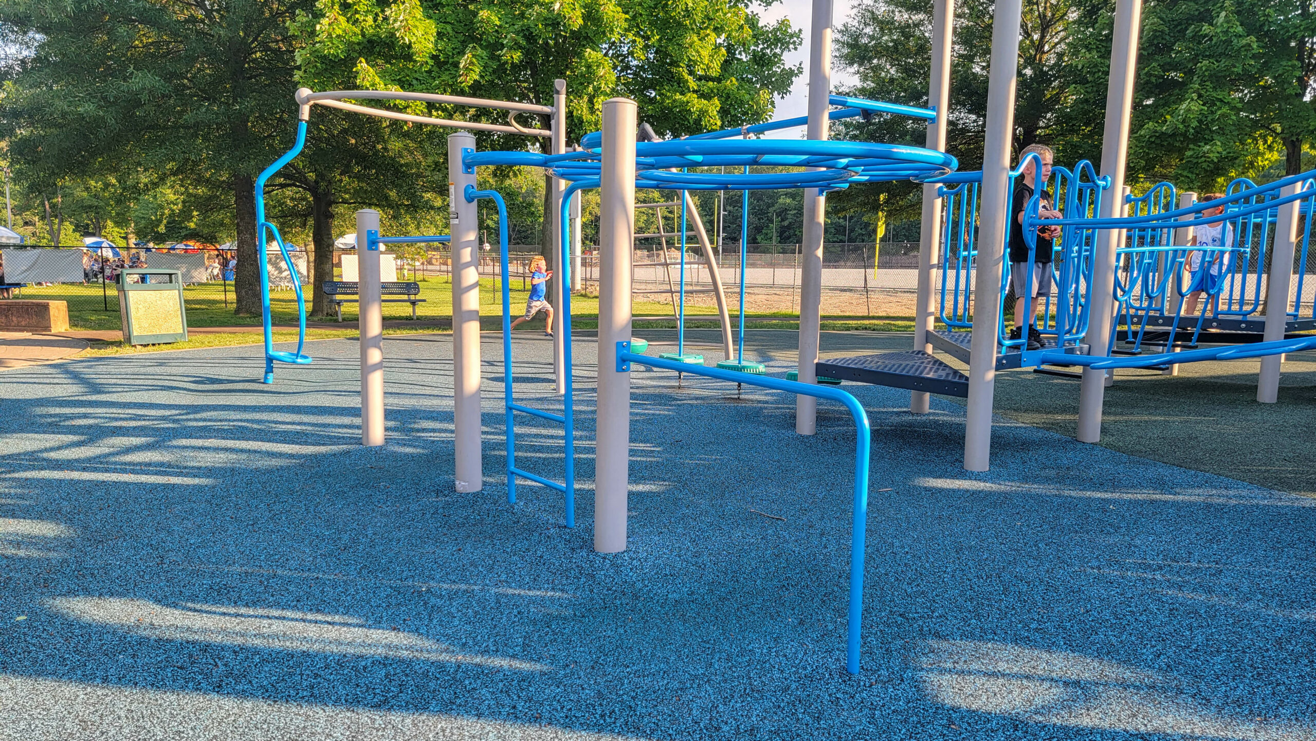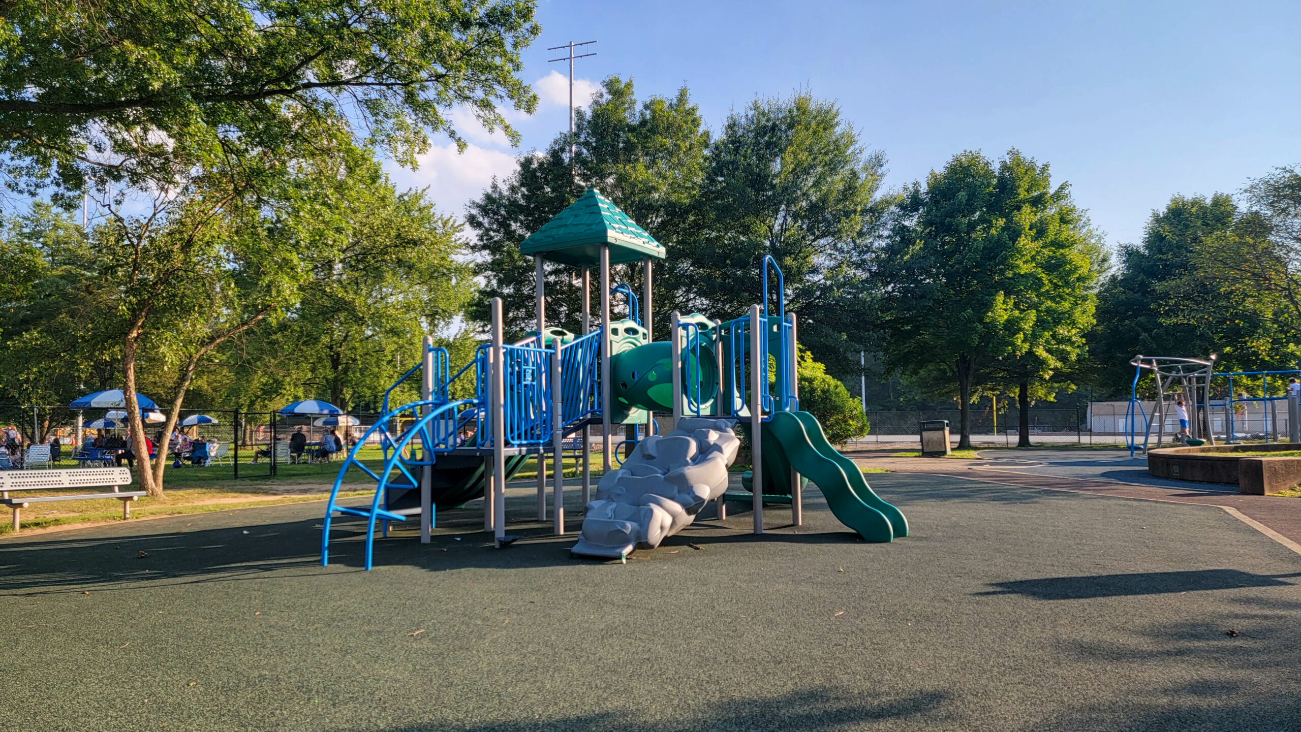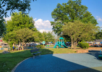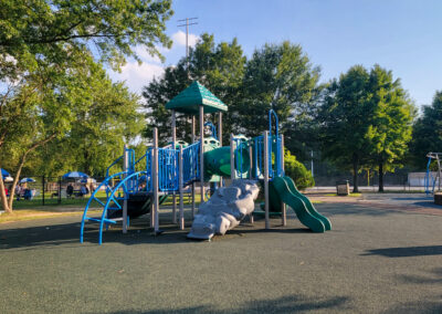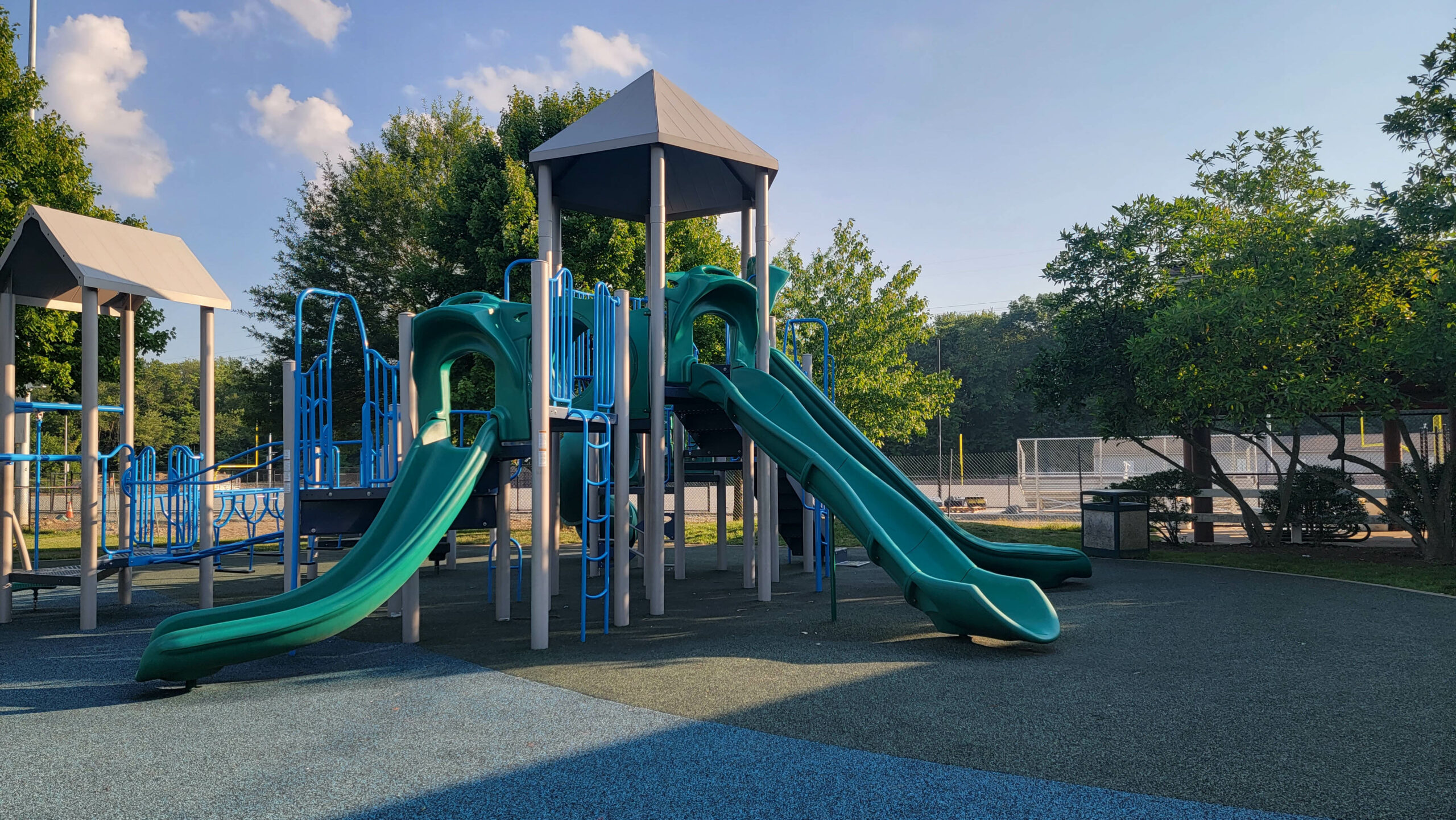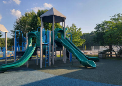 Busy town recreation complex with ball fields, roller rink, tennis, town pool and recreation center. Hosts summer concert nights and Farmers Market. Great playground made of Trex and metal with rubber flooring (very cushiony!) Hosts summer playground programs during the week so is very crowded during the day. Two separate play areas for 2-5 and 5-12 year olds.