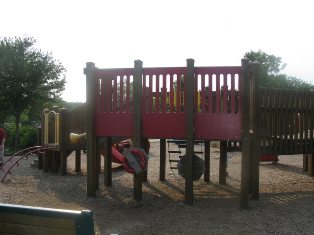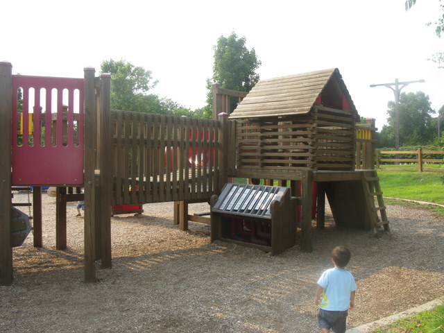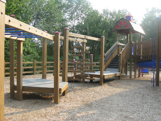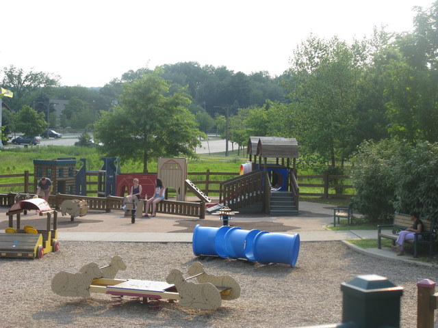 Handicap: The playground area is wheel chair accessible with ramps throughout and two swings which can accommodate chairs. You need to call the recreation center or stop by as you enter the park in order to have them un-locked. The equipment centers are not entirely wheelchair accessible and they are almost all centered in mulch.