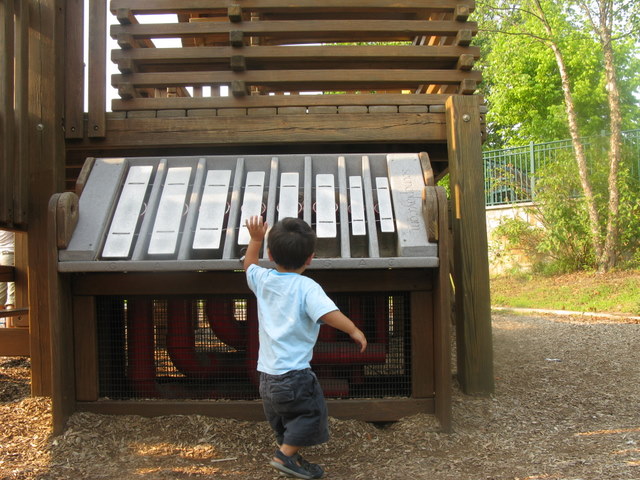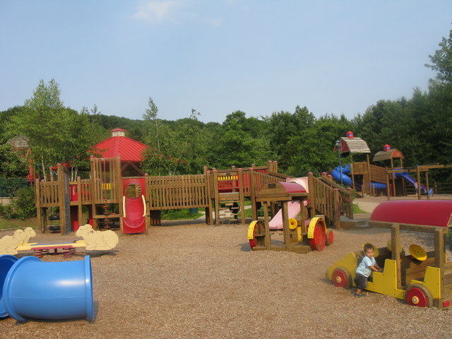 Playthings: Tubes, music center with chimes, a little mall with a dairy, log cabin, barn and silo, steering wheels, call boxes, wooden race car and train