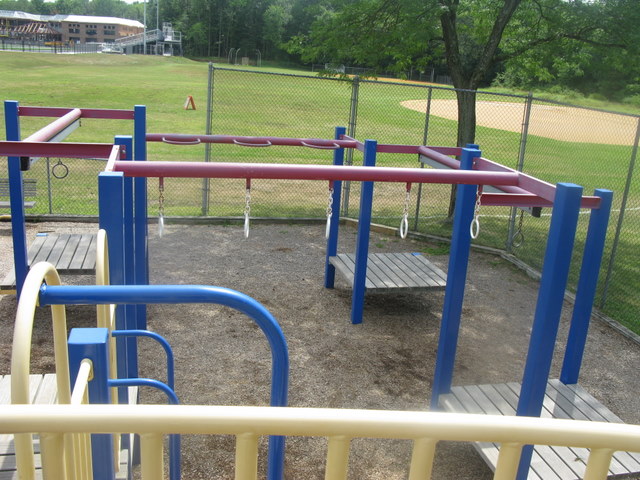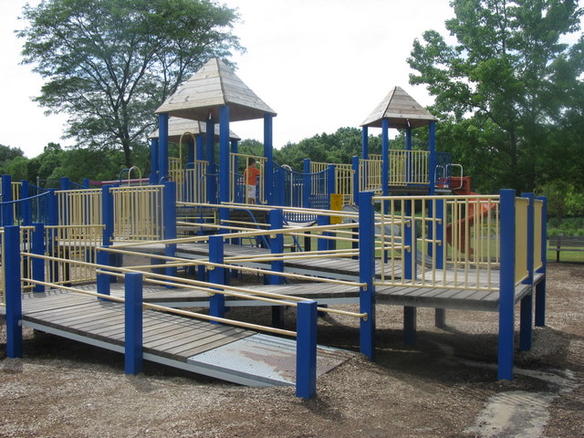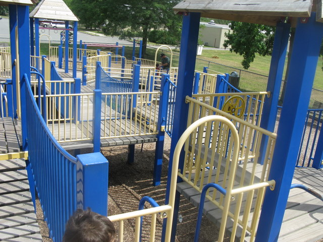 This is a very popular park in Livingston, and my kids loved the ramps. It is a great shady little playground, with a generous amount of sand toys for the children to share. The pre-school and school age structures are woven together. The suspension bridges are a good deterrent for the younger kids to go over to the school-age side, but the brave ones will venture over.