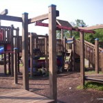 A large, wood-and-tire playground with two big climbing structures, slides, swings, tire swings, bridges, tunnels. There is no shade here and it gets hot mid-day.