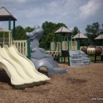There’s a large bouncy dinosaur and some bouncing vehicles, balance beams, and a huge beach volleyball court that is usually used as a giant sandbox. Lots of swings, too.