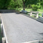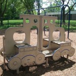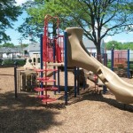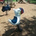 There are two regular swings and two infant swings. Two rocking items. Lots of shade, benches, and a picnic table. No bathrooms, though the library is next door. There’s also a beautiful bocce court (of all things) just outside the playground fence.