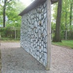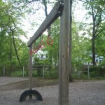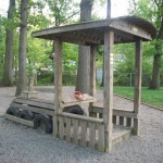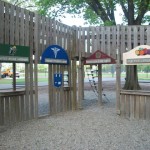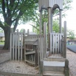 The playground has a large structure with store fronts beneath, and a very fast slide, a separate smaller structure with a slide and tiny sandbox, a train climber, a set of ring-style monkey bars, a very large, two-sided concrete climbing wall, and a swing set made from the largest single wooden beam I have seen in a long time.