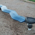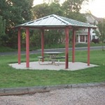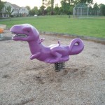 The playground has a fairly standard plastic and metal climbing structure, and a little picnic shelter next to it. Then there is a cool rocking purple dinosaur, a big metal jungle-gym, and your standard swings (including 2 infant).