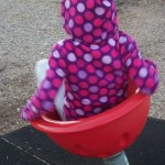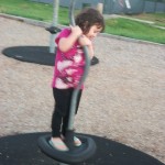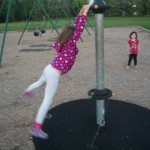 But the highlight is the spinners. There is a tire swing, a stand-up spinner, two sit-down spinners, and what turned out to be a pole designed for spinning while hanging from your hands, with feet flying way out behind you.