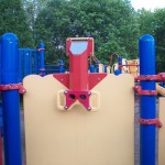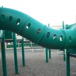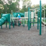On the other side of the school is the playground for older children (though my 3 year old loves it, too) featuring what are essentially three interconnected play structures with high slides, a cool periscope, monkey bars, lots of different climbing equipment, a spiral pole, more. They also have a zip line, a map of the US, basketball nets, a huge backboard, and a hill that is perfect for rolling down. (A great spot also for sledding)