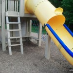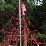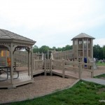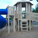 This one is a beautiful and unusual wooden playground, with a gazebo connected by a ramp to the main play structure. There are many slides, interesting bridges, secret hiding spaces, and a challenging hanging-board climber. There are swings (no infant) and a huge rubber coated chain climber, with two swings inside (a twist I haven’t seen before).