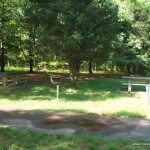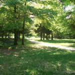 There are two swings as well, but the main attraction is a beautiful, shady picnic grove right next to the playground and a lovely, shady, paved walkway leading off through the woods nearby.