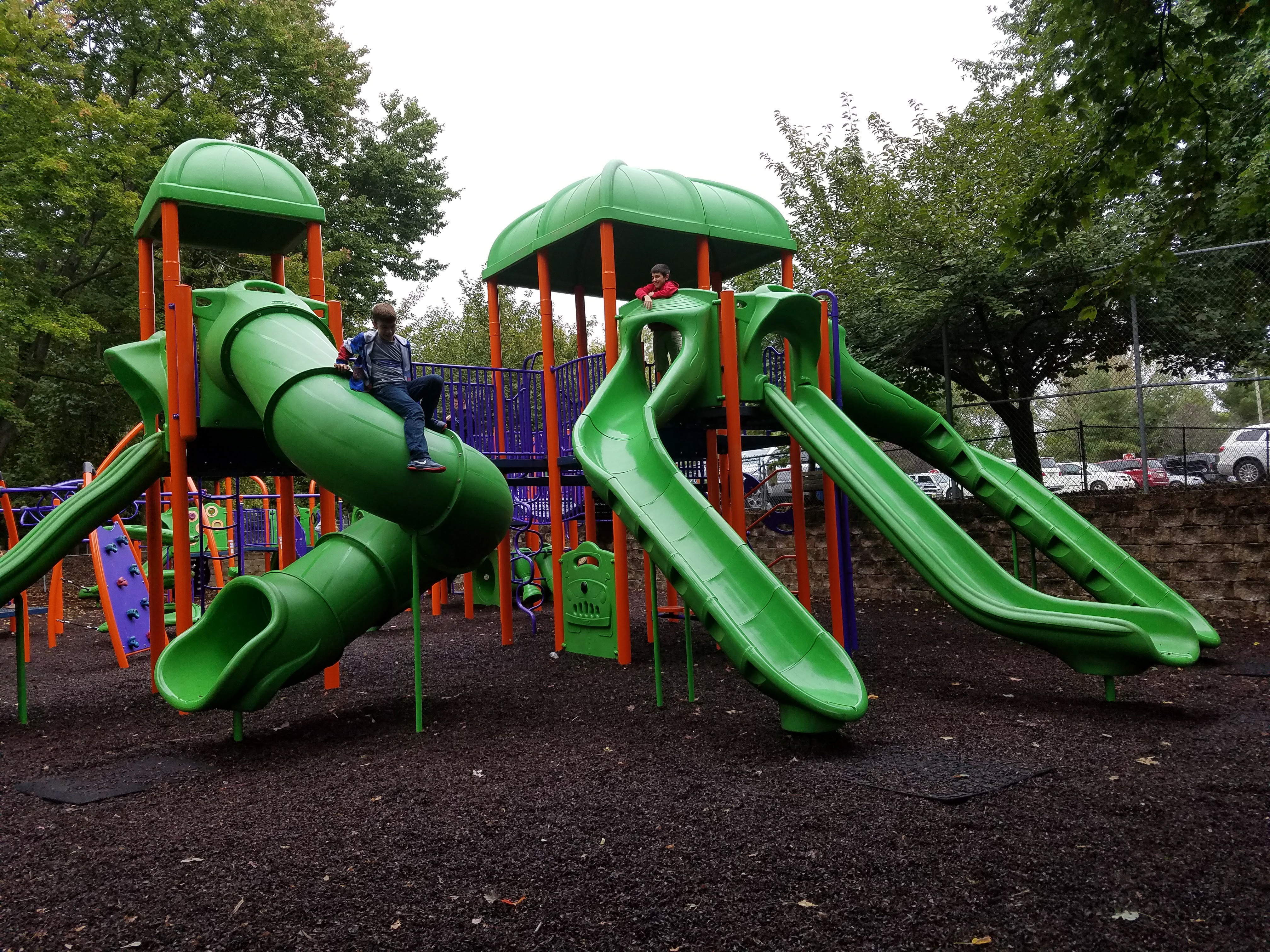 This park was renovated in 2014 and now looks completely different. Very nice, great equipment and the chipped rubber surface is much nicer than mulch.