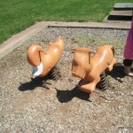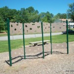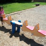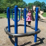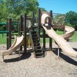 There is a large play structure with a tube climber, a merry-go-round, a stand-up circular bouncer, a 4-person seesaw, two rocking animals, a horizontal climbing wall, swings, and a large picnic shelter (but without tables). The park is sunny and has no bathrooms. There is also a large open field, and it’s located a the end of a quiet residential street.