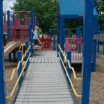 HANDICAP: Playground is handicap accessible with a large ramp and lots of things to do once you read the top. There is a large platform area to turn and maneuver a wheelchair. The base of the playground is full of little niches and playthings. The ground cover is mulched which may make it challenging to move around.
