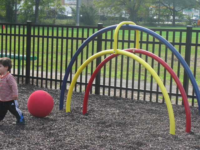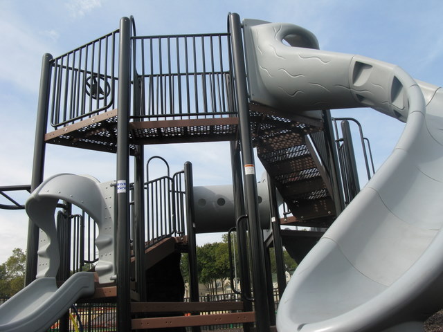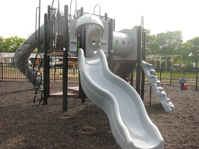 DESCRIPTION: Nicely fenced in with new playground equipment in a busy sports complex that includes the town pool. Rubber mulch. Equipment meant for 2-5 or 5-12 year olds. Not much shade. Sure to be busy on the weekends!