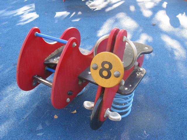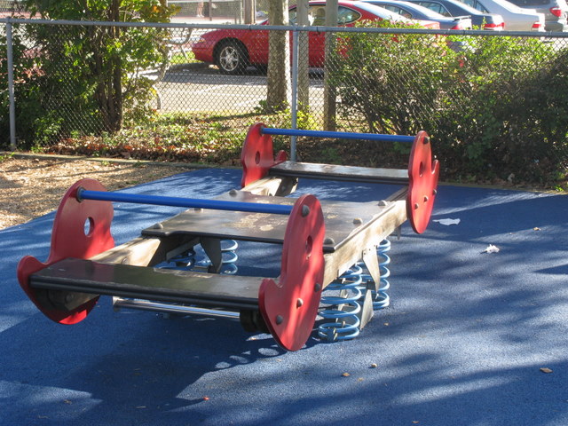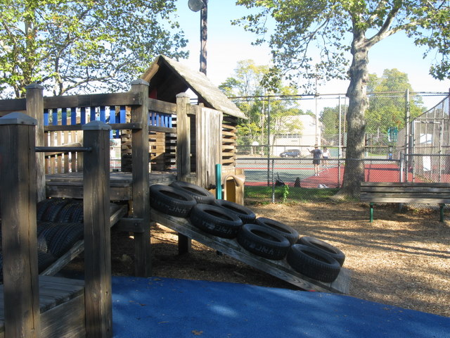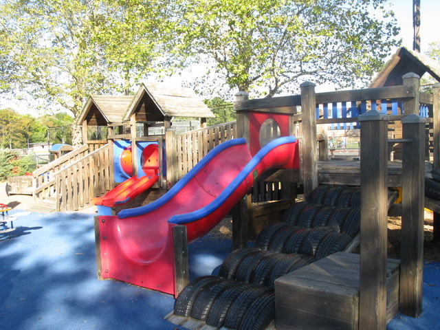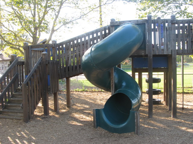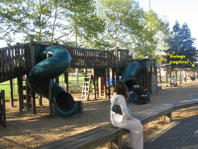 The hill with the two longs slides through the trees was the hit of this playground. My kids had a great time here. They also liked the big multi-person seesaw and lots of other slides.