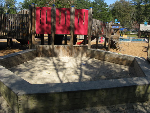 Handicap: Two red chair swings, park area itself is wheelchair accessible but not all equipment, if you can navigate the mulch, a wheelchair can be pulled up to elevated portion of sandbox for easy play