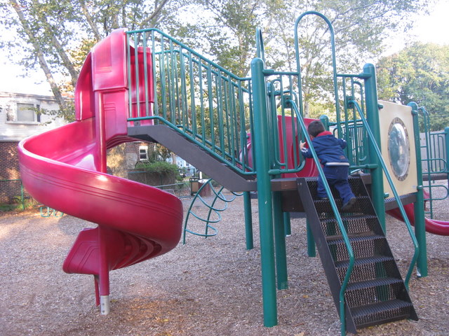Greenside Playground is still a hot-spot among moms groups and toddlers/preschoolers. It’s shady, fenced-in, and as of March 2012, the woodchips have been replaced with rubber mulch. The equipment is all very clean and well-maintained. There are 2 sets of baby swings and 4 regular swings, as well as a toddler-friendly climbing structure with slides. Greenside is also one of the few playgrounds around with a merry go-round. Because it is completely enclosed, Greenside is one of the only playgrounds where I feel safe letting my preschool-aged twins run free!