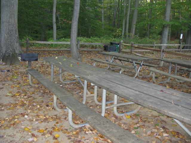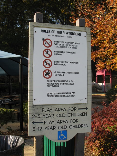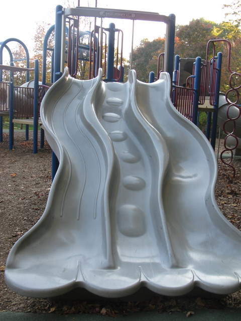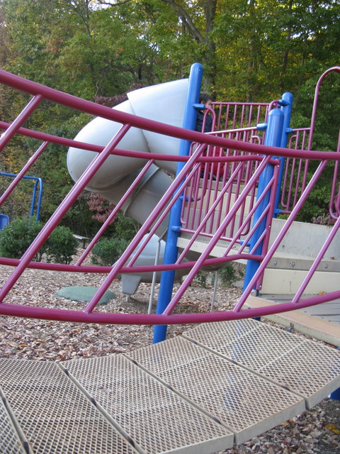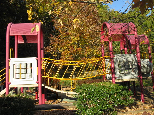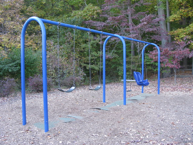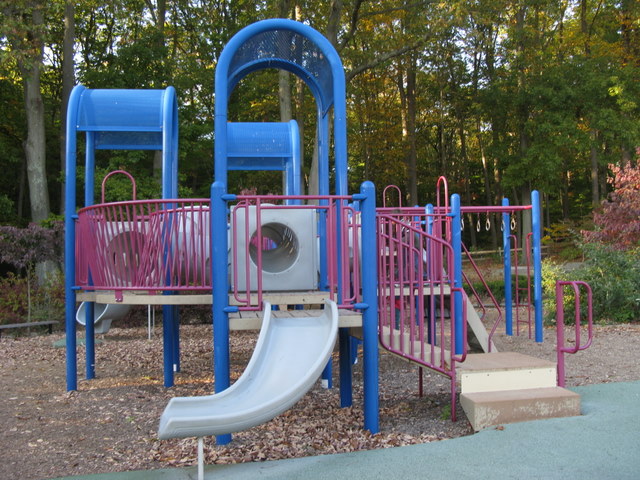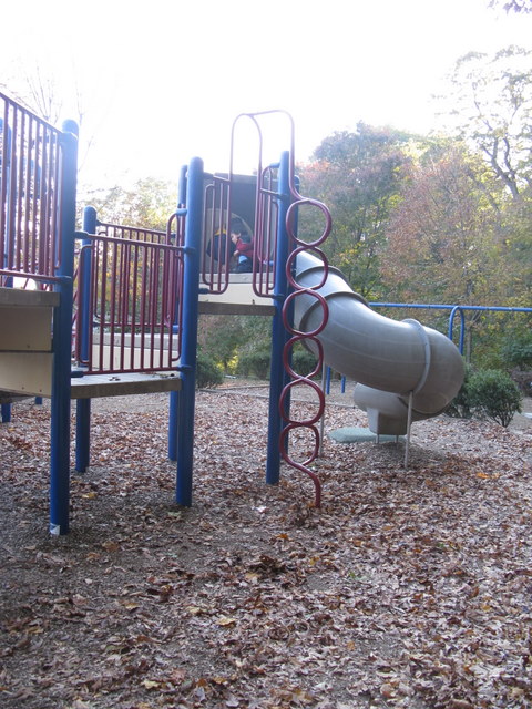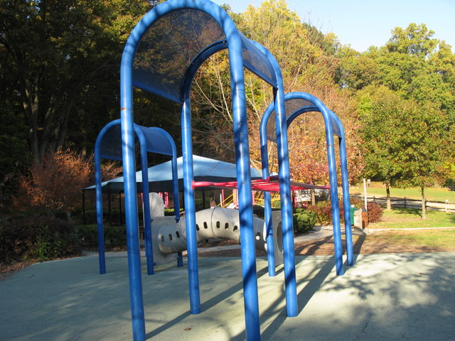 Swings, slides, plenty of stuff for both pre-school and school-age kids.  It is an expansive park, which has plenty of picnic tables and small grills overlooking the playground.  Pictures below…