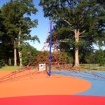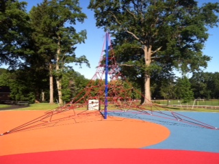 Ponderosa farm (located on 1600 Cooper Road, Scotch Plains NJ) is a beautiful 23-acre park (opened June 2012) has two large playgrounds (one for older kids and one for younger kids). There are swings, rock climbing walls, multiple slides, tunnels and rope climbing sculptures. My three year old loved the big boy playground, climbing up the rock walls and going down the tunnel slides. He walked across the safe and secure rope walk too. My one year old daughter enjoyed the swing but I imagine we will be back very soon for her to explore the little ones playground. This playground is great for one and two year olds and they can feel more secure being away from the big kids. In the middle of all the playgrounds is a large water playground. All of this sits on a very soft and colorful turf.
