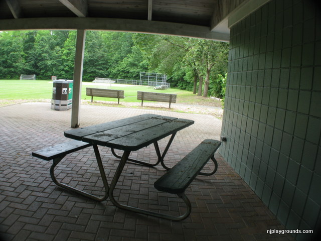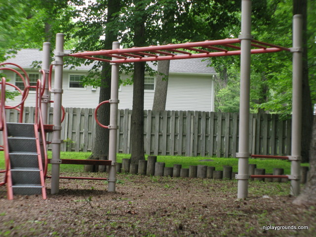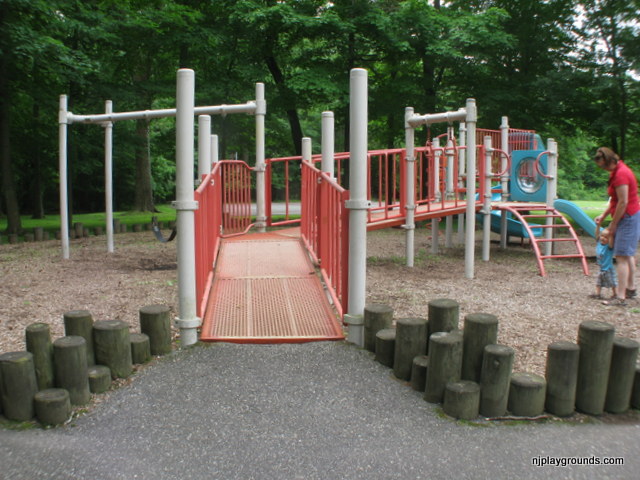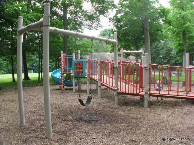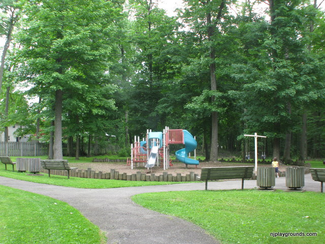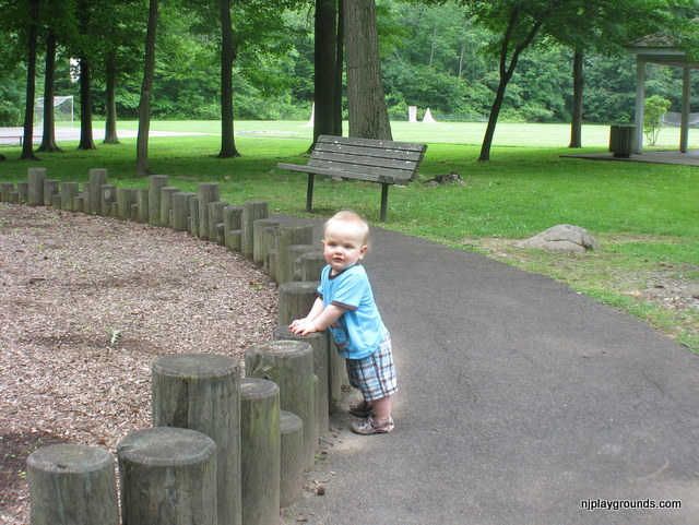 Richard Park is a small neighborhood park set in a quiet areaa few yards from the intersection of Richard and Parkview Avenues in West Caldwell. There are 2 small playgrounds set apart from each other with these wooden posts perfect for a cruising toddler. The ground cover is woodchips so it isn’t a great spot for crawlers. If you are close by it is a great spot to stop and play. There is a gradual ramp for handicap access.