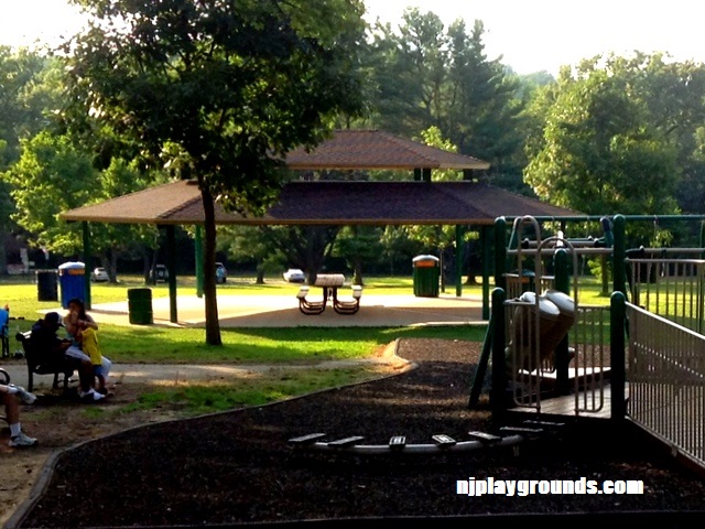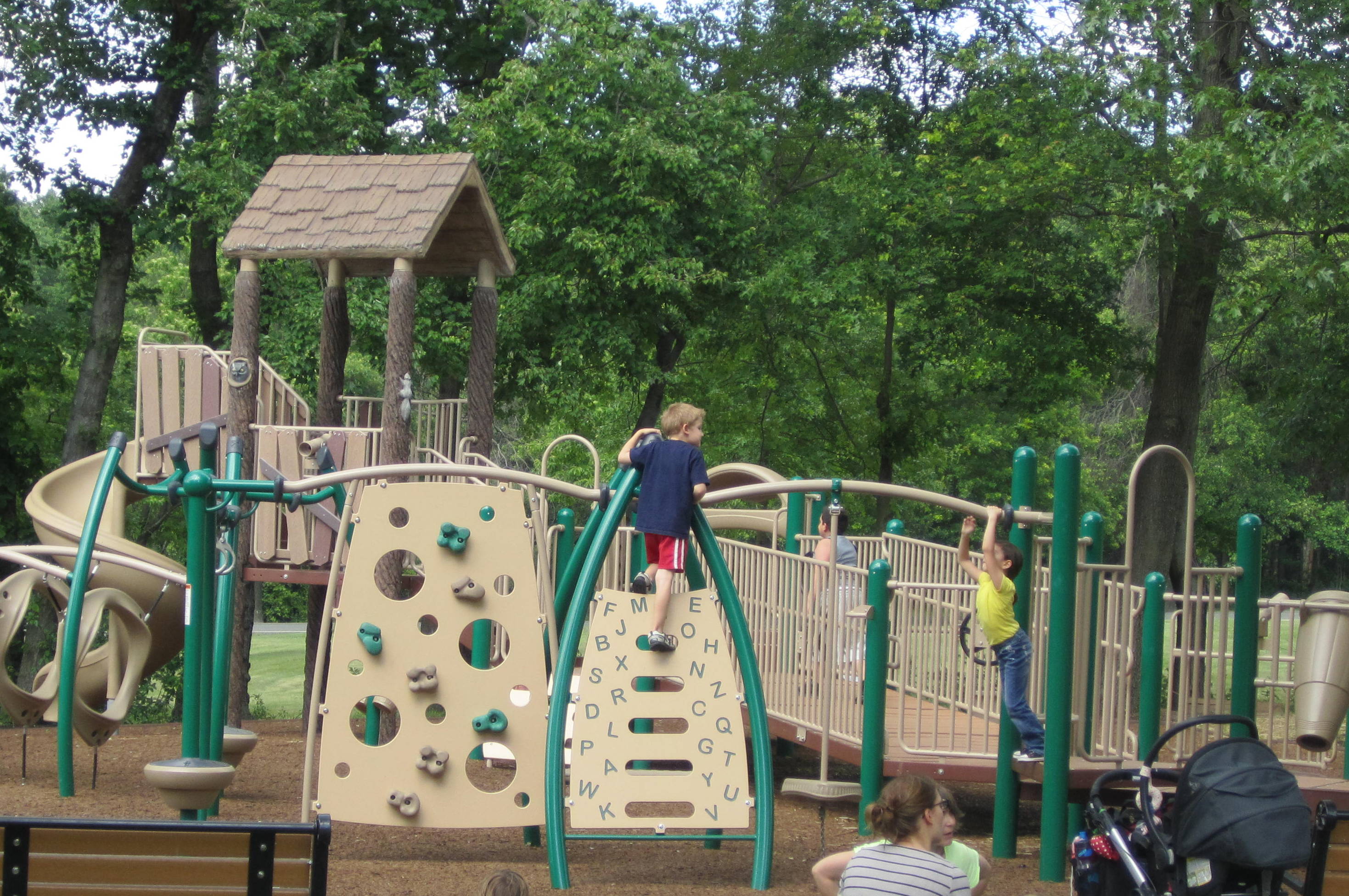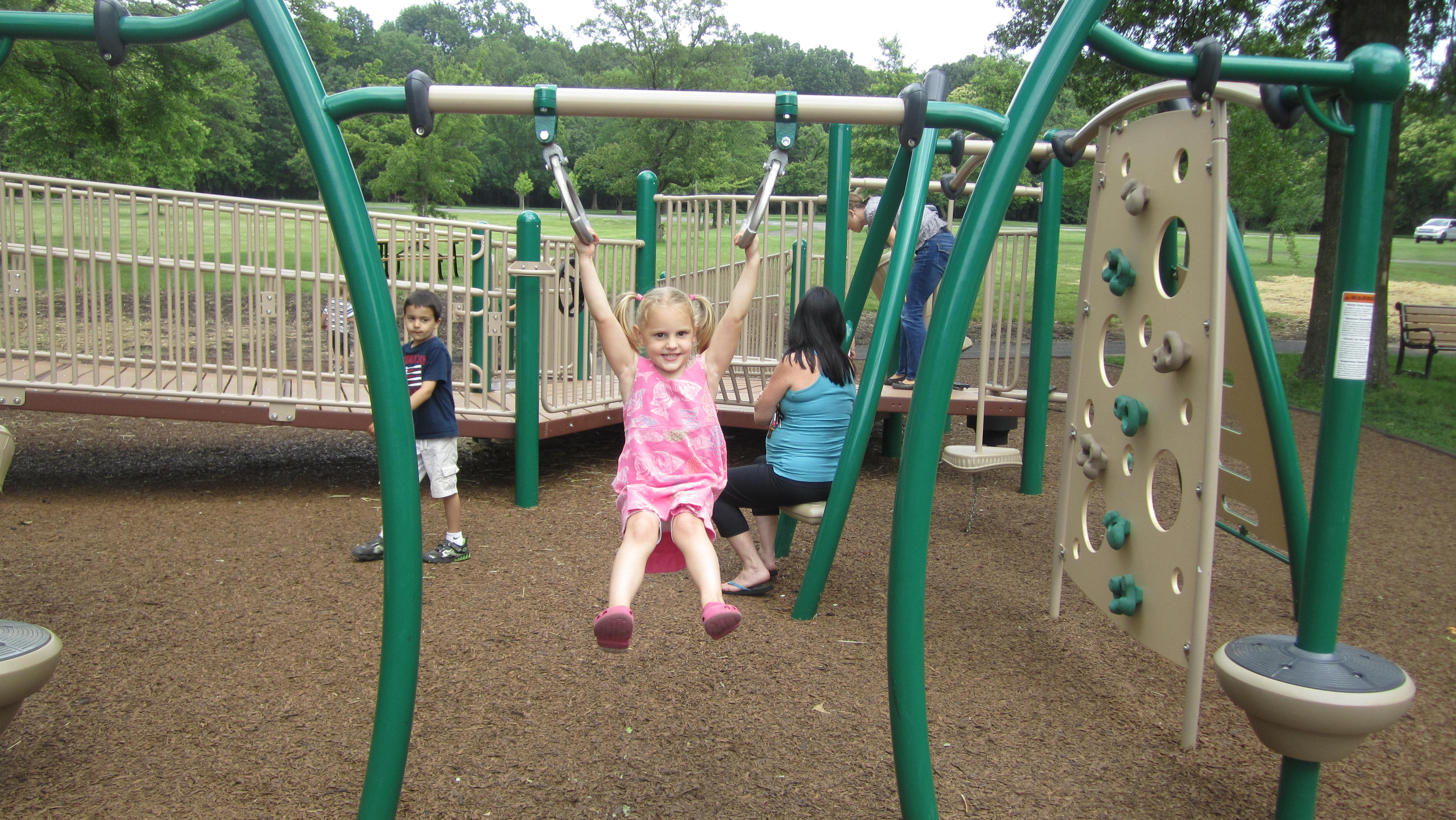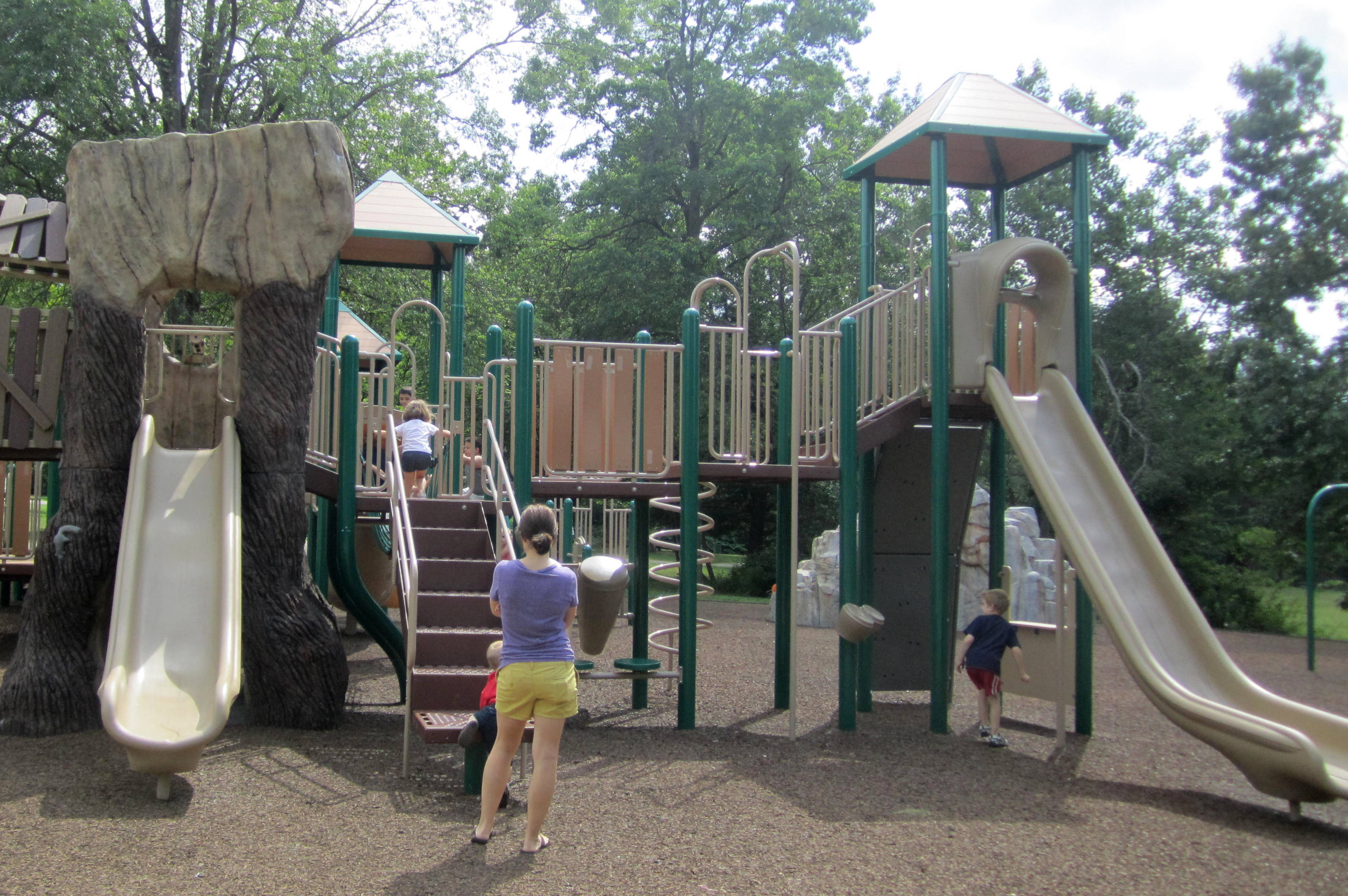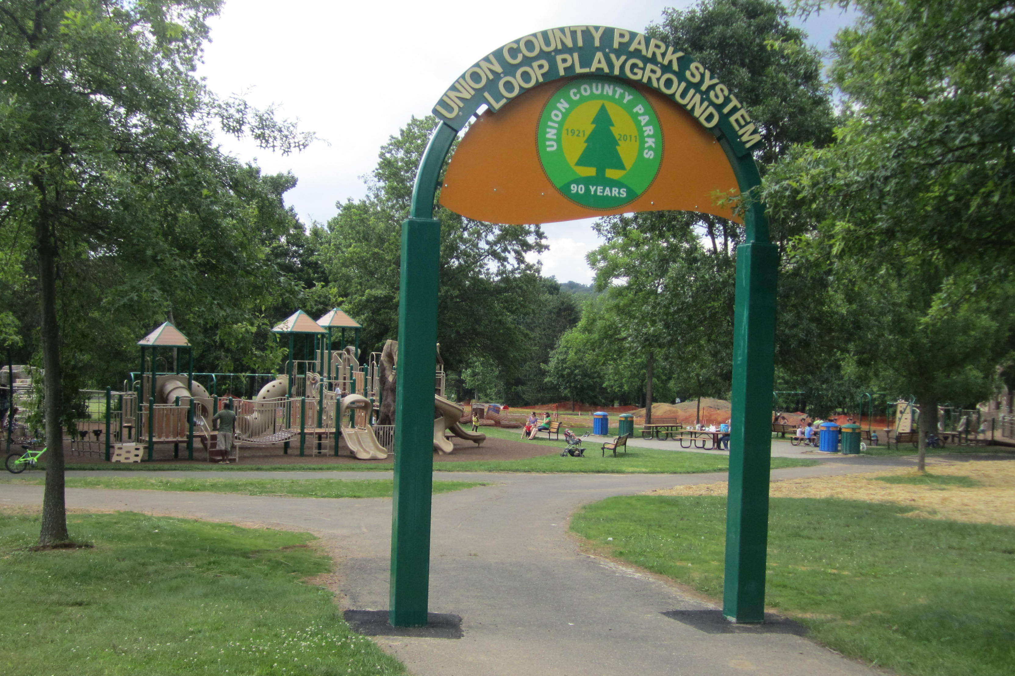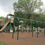 The Loop Playground is tucked inside the Watchung Reservation in Mountainside, NJ. They recently tore down the all-wood playground equipment and replaced them with newer all-weather climbing structures. Since this is such a beautiful, natural park, I was skeptical that anything but wood would look right and that this playground may lose that natural feel we had grown to love. I am so happy to say that I was wrong. This new playground, while built with the metal and plastic structures that will hold up to weather, still manages to feel natural and fits in with the lush green surrounding landscape.