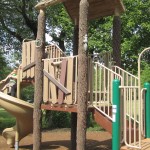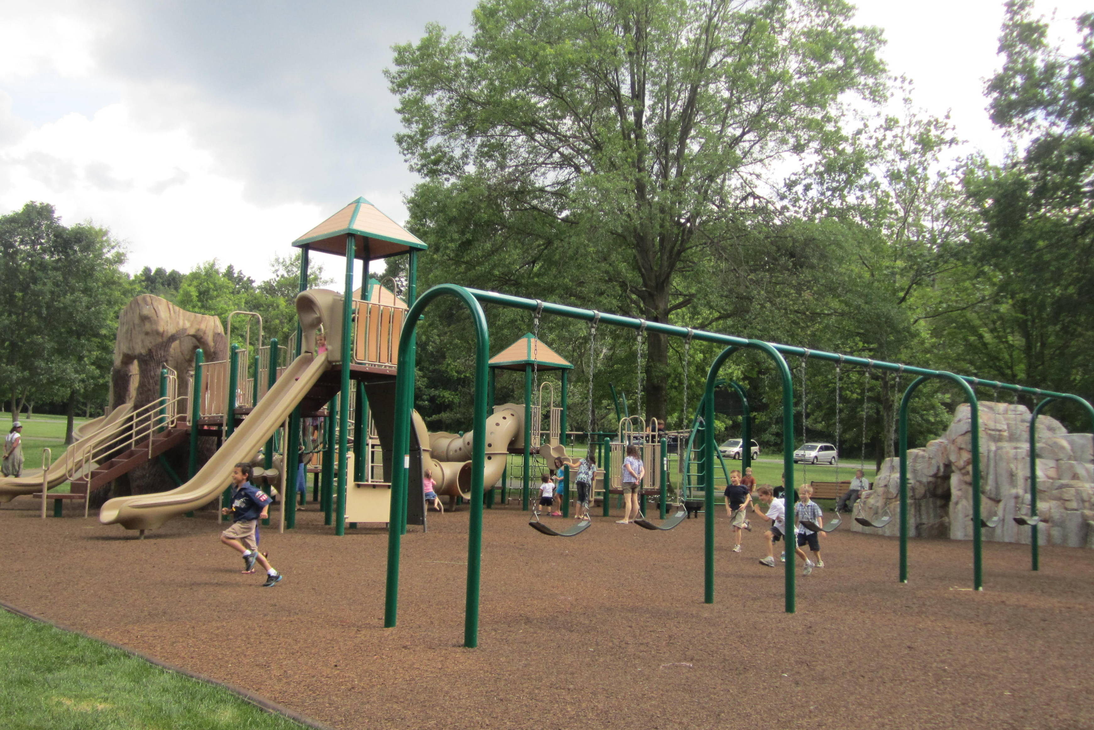 Two new climbing structures have been erected, both featuring towers, tunnels and caves, all made to look as natural as possible. The larger side of the playground is ideal for older children and features five different slides, one of which may be the tallest, steepest slide in the area. The oldest kids will get a thrill out of zooming down this one. Lots to climb here, too, including two heavy-duty rope walls and a fantastic, tall, rock wall formation. Six big kid swings hang along the back side of this section. A full row of Tunnels, caves, bouncy bridges, ladders, lookouts, drums and steering wheels make this a playground dream.