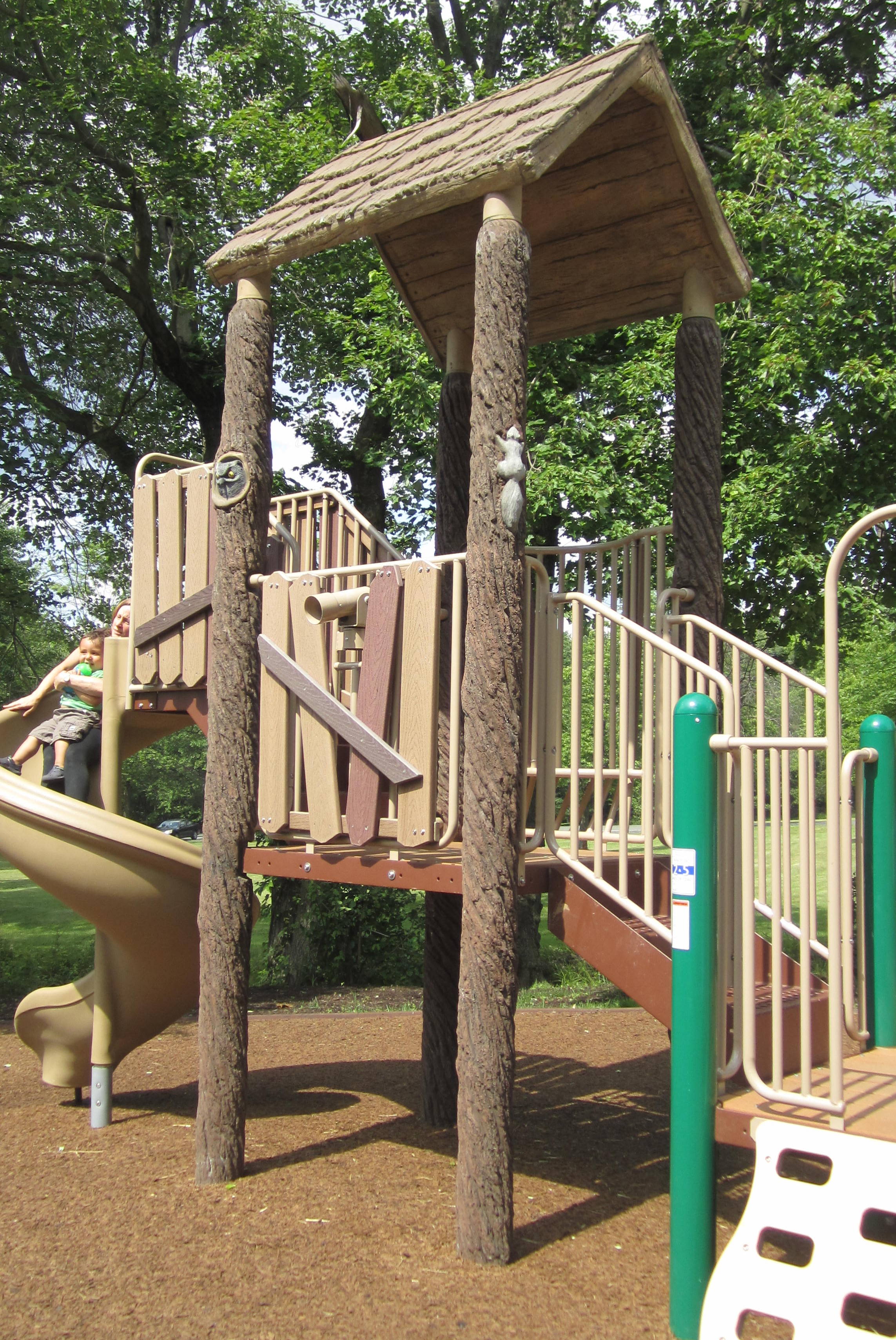Across the picnic area patio is the younger set of playground equipment, great for smaller children. This structure mirrors the natural finishes and its tallest tower even features a “carved” tree trunk with woodland friends like a fake owl and squirrel for the kids to examine. Wider slides and bridges over here are great for parents who need to stay close to the little ones as they play. This side also has a full row of baby/toddler swings for the little ones, too.
