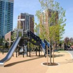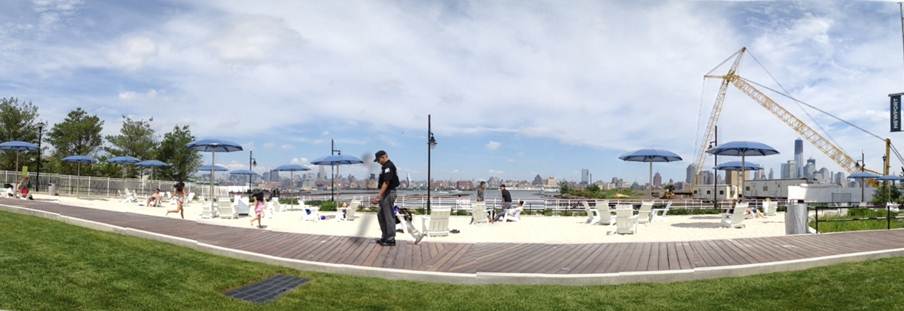 It’s the first they knew of with multiple water-spray features; a tower with dump buckets that fill-up and sporadically drench their kids; and rows of swings, slides and climbing domes for those staying dry. But the best that kept drawing them back they said was the Urban Beach. It has the right kind of sand for castle-building (would you believe it’s from Long Beach Island?), a few dozen Adirondack chairs for lounging and colorful umbrella fixtures for shade.”