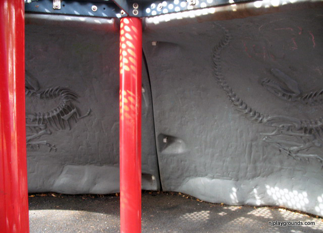 Other: Monkey bars, fireman pole, two steering wheels to steer the ship, DINOSAUR FOSSILS under the ship play area for hiding. This area is NOT enclosed