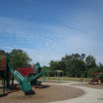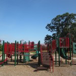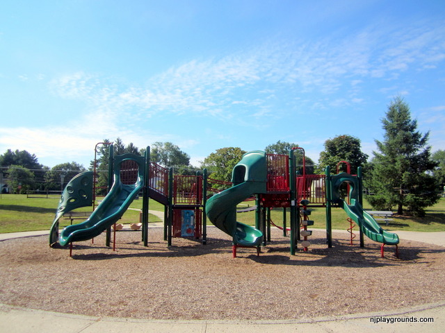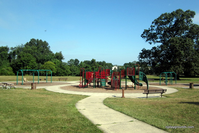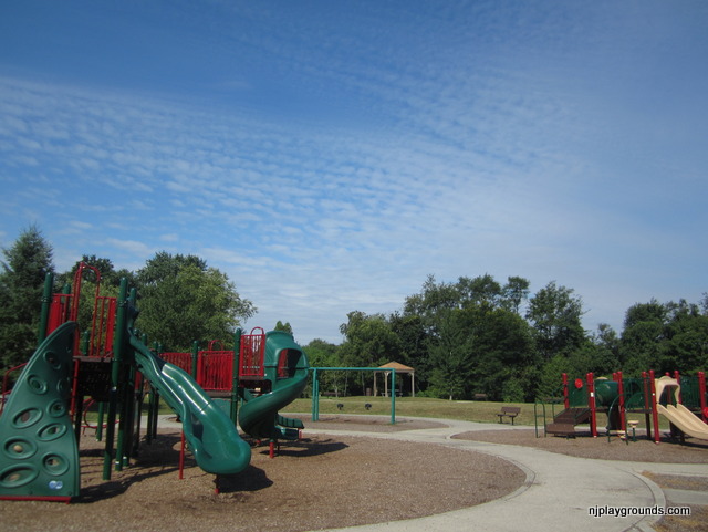 Great Oak Park in East Brunswick (Middlesex County) is a small family park with a lot to offer. There are several picnic tables and a small gazebo which can be used for small gatherings and parties. There is a walking path that goes around and through the main areas of the park. It is perfect for walking with strollers and is also great for kids on bicycles who can ride and yet never be out of sight of parents on the playground with smaller children. The playground area has two structures. The smaller one is rated for kids 2-5 and the larger one is for 5-12 year olds. These structures are new and in excellent condition. There are also two sets of swings, with regular and infant seats. There is one large swing with a 5-point harness designed for children with disabilities.