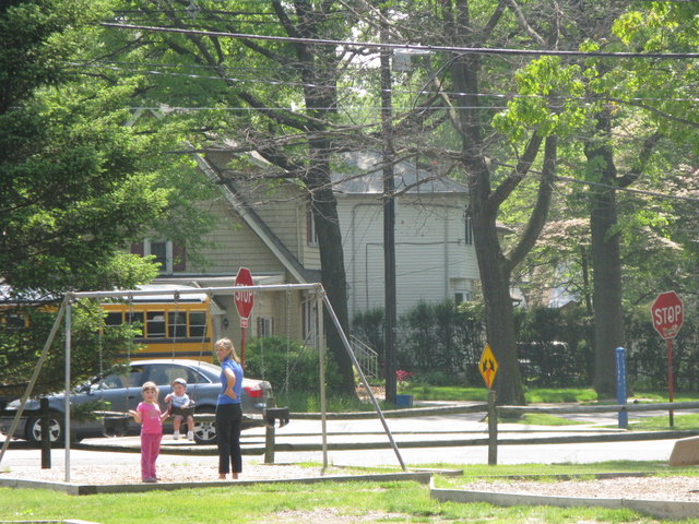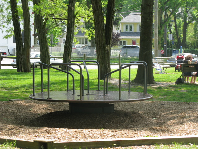 Basketball court in park, very spread out playground. Friendly moms here, and the merry go round is a big hit for kids, but watch out for the little ones, since there is no speed control, bigger kids can spin it pretty fast. No bathrooms and a big sandbox.