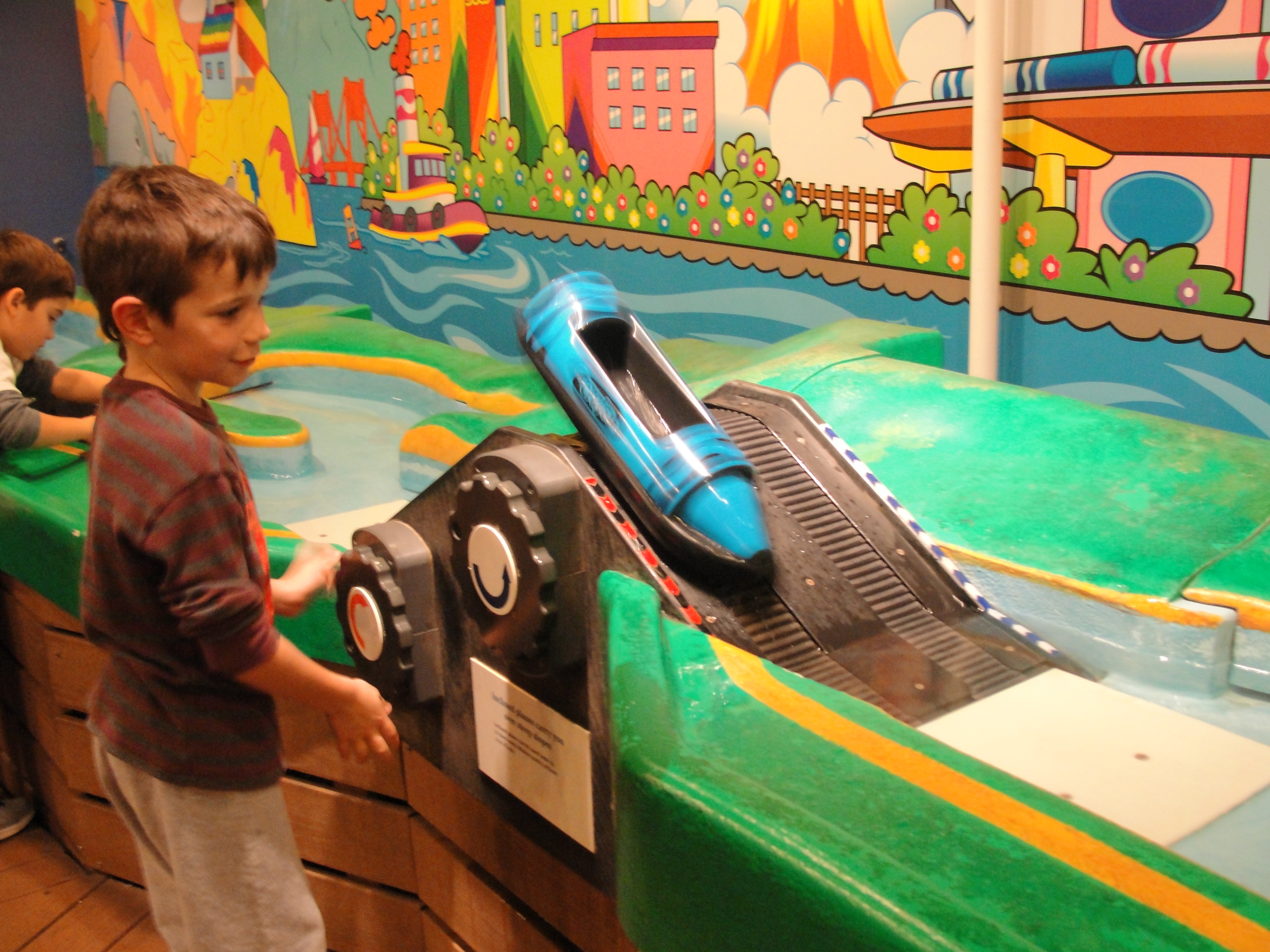 the WaterWorks exhibit, a play space, featuring, you guessed it, every kids’ favorite, water. Cute little Crayola boats navigate a river complete with locks and other engineering marvels that facilitate water based transportation. Educational and fun… definitely the theme for the day!